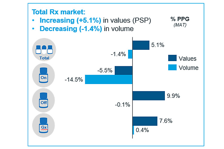 Στα off patent η τάση ήταν αυξητική στην αξία των πωληθέντων και οριακά πτωτική στους όγκους. Συγκεκριμένα, η αξία των πωληθέντων ενισχύθηκε κατά 9,9%, ενώ οι όγκοι μειώθηκαν οριακά 0,1%.