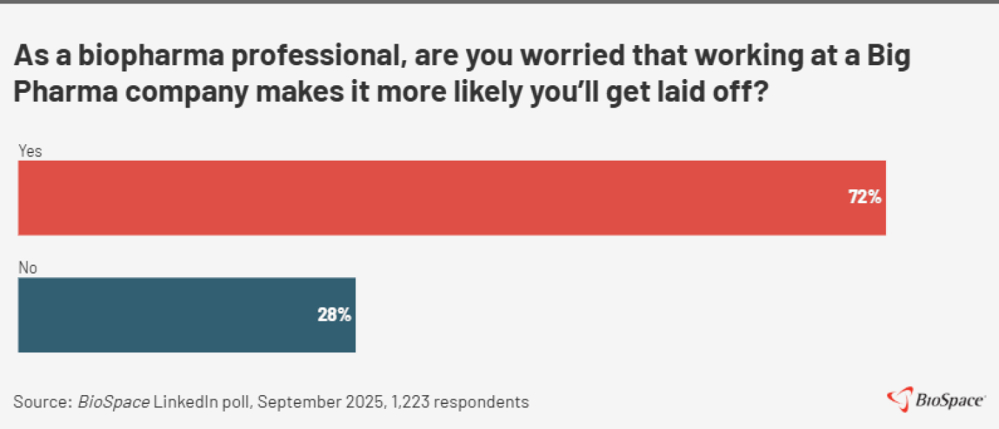 Η έρευνα του BioSpace στο LinkedIn διαπίστωσε ότι το 72% των ερωτηθέντων ανησυχούν ότι η εργασία τους σε μία από τις εταιρείες της λίστας είναι πιο πιθανό να χαθεί.