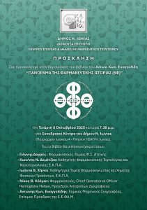 Ο Δήμος Νέας Ιωνίας και η Διοικούσα Επιτροπή του Κέντρου Σπουδής και Ανάδειξης Μικρασιατικού Πολιτισμού διοργανώνουν την παρουσίαση του βιβλίου του Αντώνη Κων. Ευαγγελίδη με τίτλο «Πανόραμα της φαρμακευτικής ιστορίας», την Τετάρτη 8 Οκτωβρίου 2025, ώρα 7:30 μ.μ., στο Συνεδριακό Κέντρο του Δήμου Ν. Ιωνίας. Η εκδήλωση φωτίζει τη μακραίωνη διαδρομή της φαρμακευτικής επιστήμης, από την αρχαία ιατρική και τη λαϊκή παράδοση έως τη σύγχρονη έρευνα και τον ρόλο του φαρμακοποιού σήμερα, ενώ αναδεικνύει και τη συμβολή των Ρωμιών φαρμακοποιών της Πόλης και των πρώτων φαρμακοποιών της Νέας Ιωνίας.
