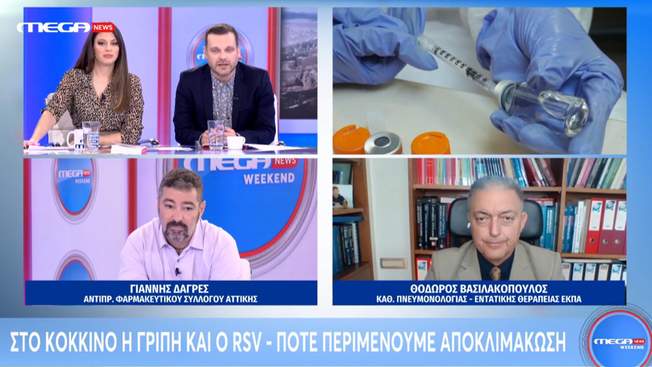 Αυξημένα είναι τα κρούσματα γρίπης και εποχικών ιώσεων αυτήν την εποχή, όπως και πέρσι και πρόπερσι, σύμφωνα με τον αντιπρόεδρο του Φ.Σ. Αττικής Γιάννη Δαγρέ που βρέθηκε στο στούντιο του MegaNEWS μαζί με τον καθηγητή Πνευμονολογίας και Εντατικής Θεραπείας ΕΚΠΑ Θόδωρο Βασιλακόπουλο.