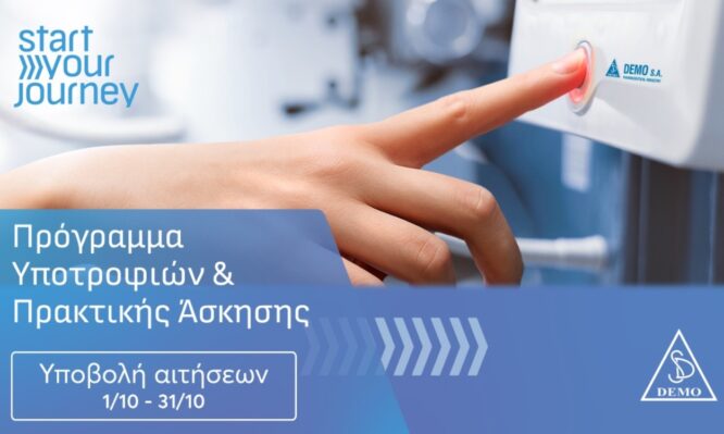 Η DEMO, ηγέτιδα εταιρεία στον κλάδο της φαρμακοβιομηχανίας, ανακοινώνει την έναρξη της περιόδου υποβολής αιτήσεων για τον 8ο κύκλο του Start Your Journey, του Προγράμματος Υποτροφιών και Πρακτικής Άσκησης της εταιρείας, η οποία θα διαρκέσει από την 1η μέχρι 31 Οκτωβρίου 2025.