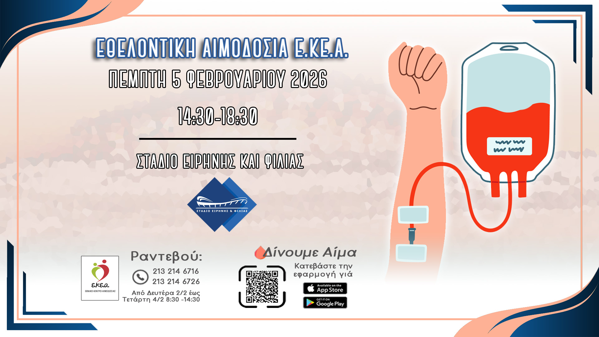 Ε.Κ.Ε.Α: «Ευθύνη είναι, να είσαι παρών» – Εθελοντική Αιμοδοσία στο Στάδιο Ειρήνης και Φιλίας (Σ.Ε.Φ.) στις 5 Φεβρουαρίου