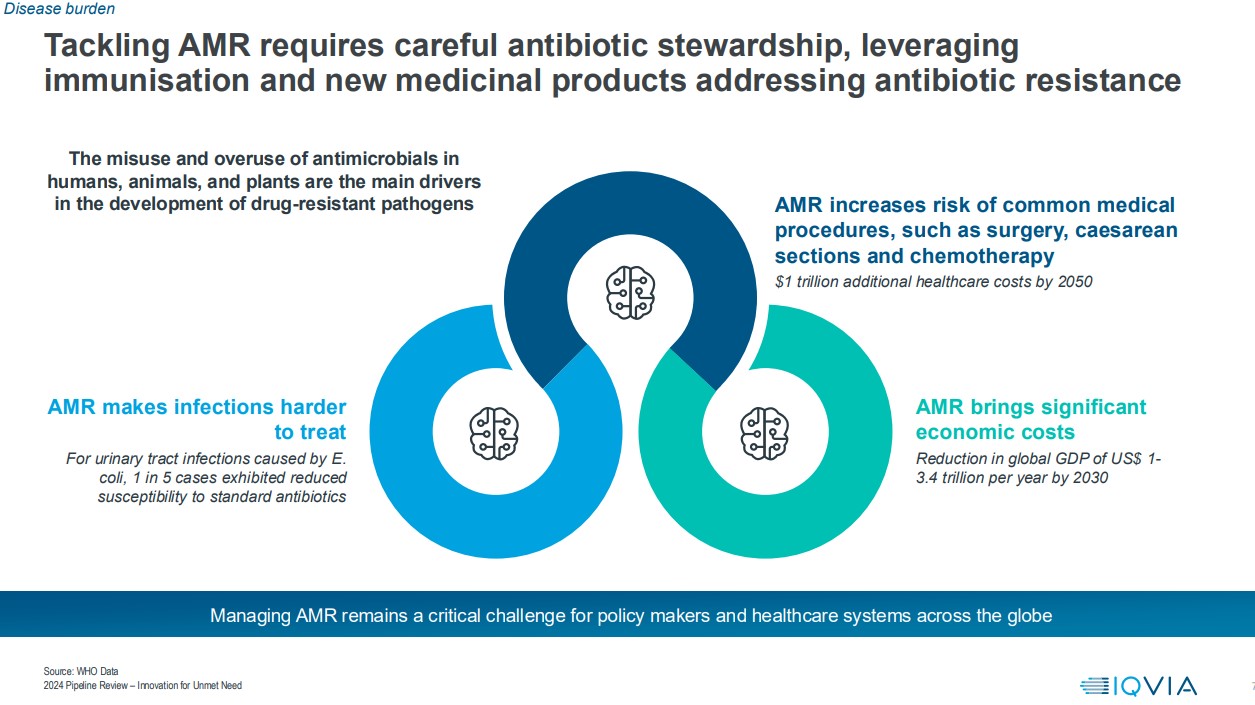 Καταπολέμηση της αντιμικροβιακής αντοχής (AMR): Καταγράφεται άνοδος των εμβολίων όπως έναντι του Streptococcus pneumoniae να βρίσκονται στο επίκεντρο, με 52 δοκιμές να έχουν αρχίσει από το 2021. Τα νέα εμβόλια μπορούν να βοηθήσουν στην πρόληψη των λοιμώξεων, στη μείωση της χρήσης αντιβιοτικών και στην παράταση της διάρκειας ζωής των νέων αντιβιοτικών. Τα νέα αντιμικροβιακά χρειάζονται επίσης για τη θεραπεία των υπερβακτηρίων που είναι ανθεκτικά στις υπάρχουσες θεραπείες, διασφαλίζοντας ότι οι ιατρικές θεραπείες και οι χειρουργικές επεμβάσεις παραμένουν αποτελεσματικές και για την καταπολέμηση της αυξανόμενης απειλής της ΑΜR.