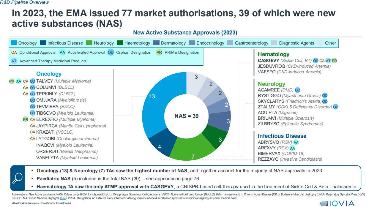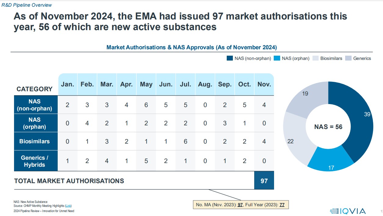 Μέχρι τον Νοέμβριο του 2024, ο EMA εξέδωσε 97 νέες άδειες κυκλοφορίας, εκ των οποίων οι 56 είναι νέες δραστικές ουσίες, σημειώνοντας αύξηση σε σχέση με το 2023, καθώς είχαν εκδοθεί 77 άδειες κυκλοφορίας και 39 νέες δραστικές ουσίες.