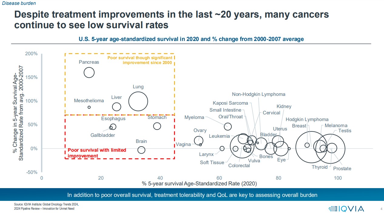 Κατέχουν σημαντικό μερίδιο των συνολικών δοκιμών, γεγονός που υποδηλώνει ισχυρές επενδύσεις σε νέες προσεγγίσεις για τη στόχευση του καρκίνου. Οι δοκιμές για ογκολογικές ενδείξεις εξακολουθούν να επικεντρώνονται κυρίως σε προχωρημένους ή μεταστατικούς καρκίνους, με καρκίνους υψηλής συχνότητας, όπως ο μεταστατικός μη μικροκυτταρικός καρκίνος του πνεύμονα (NSCLC) & ο καρκίνος του μαστού να αποτελούν ιδιαίτερα σημεία εστίασης της κλινικής δραστηριότητας. Οι καρκίνοι με χαμηλά ποσοστά επιβίωσης, όπως ο καρκίνος του παγκρέατος και ο καρκίνος του παχέος εντέρου, αποτελούν επίσης ενεργό πεδίο κλινικής δραστηριότητας.