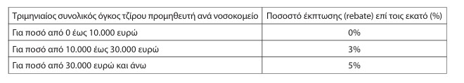 Συγκεκριμένα, προβλέπεται στο ΦΕΚ ότι για κάθε ιατροτεχνολογικό προϊόν και προϊόν αντιδραστηρίων, πλην των μηχανημάτων που χρησιμοποιούνται για την πρόληψη, διάγνωση ασθενειών ή νοσημάτων ή για την ανίχνευση, μέτρηση της δομής ή λειτουργίας του σώματος για κάποιον ιατρικό σκοπό, που προμηθεύονται με δημόσια σύμβαση, μέσω της Εθνικής Κεντρικής Αρχής Προμηθειών Υγείας ή άλλης αρμόδιας αναθέτουσας αρχής ή απευθείας τα Νοσοκο μεία του Εθνικού Συστήματος Υγείας και οι αποκεντρωμένες μονάδες αυτών, το Ωνάσειο Καρδιοχειρουργικό Κέντρο, το Νοσοκομείο Παπαγεωργίου καθώς και όλα τα δημόσια νοσοκομεία, καθιερώνεται κλιμακούμενο ποσοστό έκπτωσης «rebate» ανάλογα με το συνολικό όγκο του τζίρου του κάθε προμηθευτή και ανά νοσοκομείο, του προηγούμενου τριμήνου, όπως ορίζεται στον πίνακα που ακολουθεί: