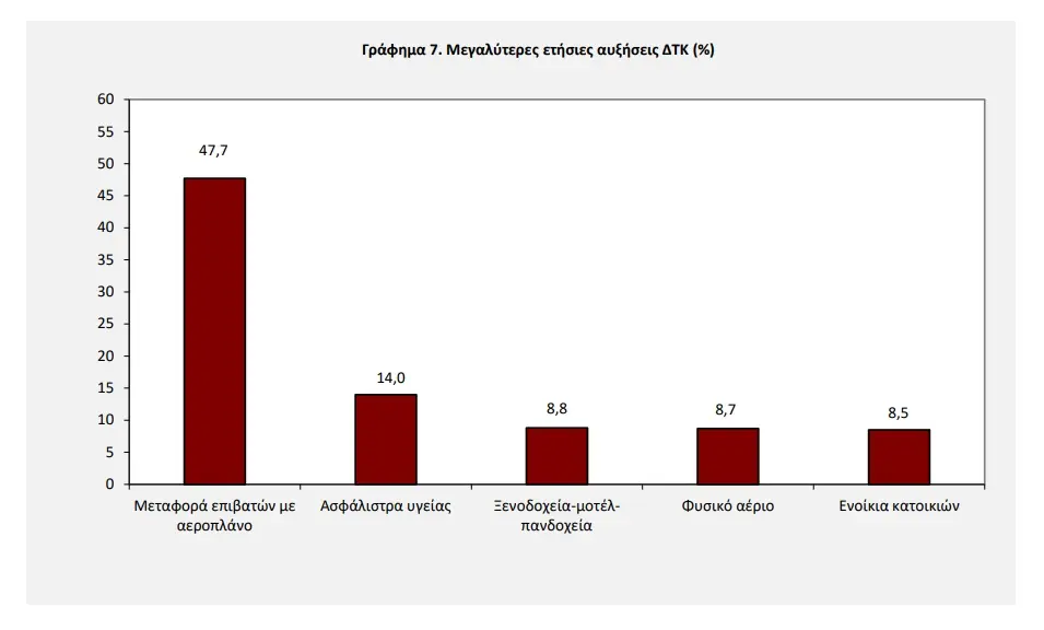 Στα αξιοσημείωτα της έρευνας της ΕΛΣΤΑΤ για τον πληθωρισμό είναι και οι αυξήσεις στα ασφάλιστρα υγείας οι οποίες υπολογίζονται στο 14% για το 2024. Πρόκειται για τη δεύτερη μεγαλύτερη ετήσια αύξηση μετά τις μεταφορές επιβατών με αεροπλάνο που έφτασαν το 47,7%.