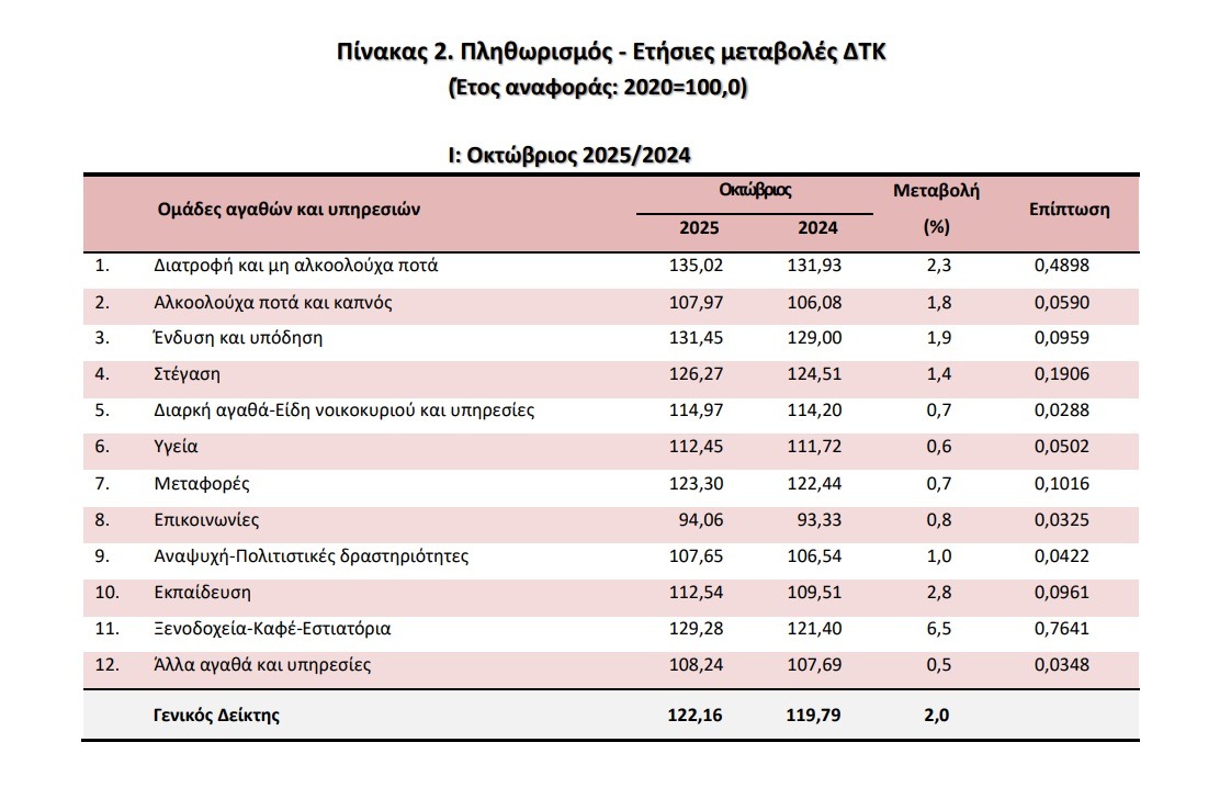 Ο ετήσιος πληθωρισμός στην Ελλάδα τον Οκτώβριο επιτάχυνε ελαφρώς, καθώς, σύμφωνα με την ΕΛΣΤΑΤ, ανήλθε σε 2% από 1,9% που είχε διαμορφωθεί τον Σεπτέμβριο.