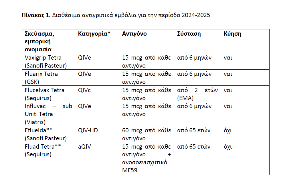 Στη χώρα μας, την χρονική περίοδο 2024-2025, αναμένεται να είναι διαθέσιμα τα παρακάτω αντιγριπικά εμβόλια: