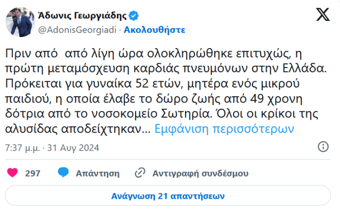 «Πριν από λίγη ώρα ολοκληρώθηκε επιτυχώς, η πρώτη μεταμόσχευση καρδιάς πνευμόνων στην Ελλάδα. Πρόκειται για γυναίκα 52 ετών, μητέρα ενός μικρού παιδιού, η οποία έλαβε το δώρο ζωής από 49χρονη δότρια από το νοσοκομείο Σωτηρία.