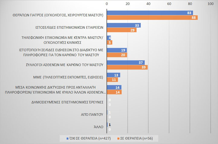 Σε σχέση με το στάδιο των θεραπειών, το 88% των ερωτώμενων γυναικών δήλωσε ότι έχει τελειώσει τις θεραπείες του ή συνεχίζει με ορμονοθεραπεία και το 12% βρισκόταν σε θεραπεία (χημειοθεραπεία ή ακτινοθεραπεία) ή είχε μεταστατικό καρκίνο μαστού κατά τη διάρκεια της έρευνας.