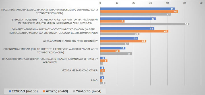 Κύριος ανασταλτικός παράγοντας για την επίσκεψη στον γιατρό αποτέλεσε ο προσωπικός φόβος των ασθενών για συνδιαλλαγή με δομές υγείας λόγω της πανδημίας. Άλλα εμπόδια υπήρξαν επίσης η αυξημένη λίστα αναμονής και η έλλειψη διαθεσιμότητας του γιατρού λόγω COVID-19.