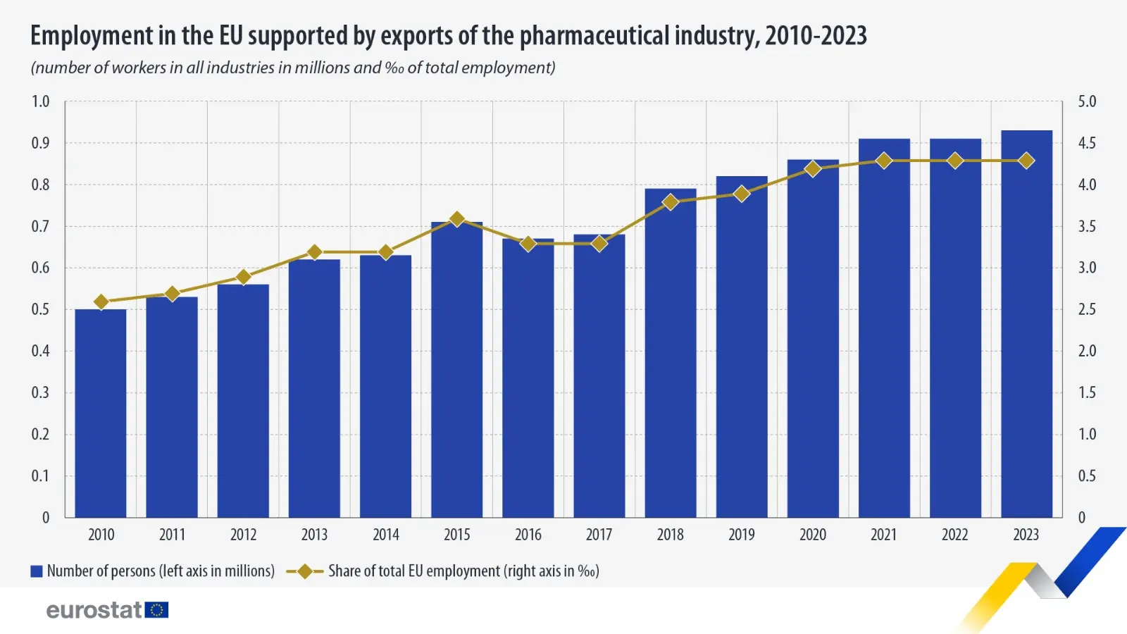 Η εξέλιξη αυτή επιβεβαιώνει τον ρόλο της φαρμακευτικής βιομηχανίας ως βασικού πυλώνα της ευρωπαϊκής οικονομίας, με ισχυρό αποτύπωμα στην αγορά εργασίας. Είναι χαρακτηριστικό ότι η συνολική απασχόληση που συνδέεται με τις εξαγωγές φαρμακευτικών προϊόντων σχεδόν διπλασιάστηκε την περίοδο 2010–2023, από 504.000 εργαζομένους σε 926.000. Παράλληλα, το μερίδιο της σχετικής απασχόλησης αυξήθηκε από 2,6‰ σε 4,3‰.