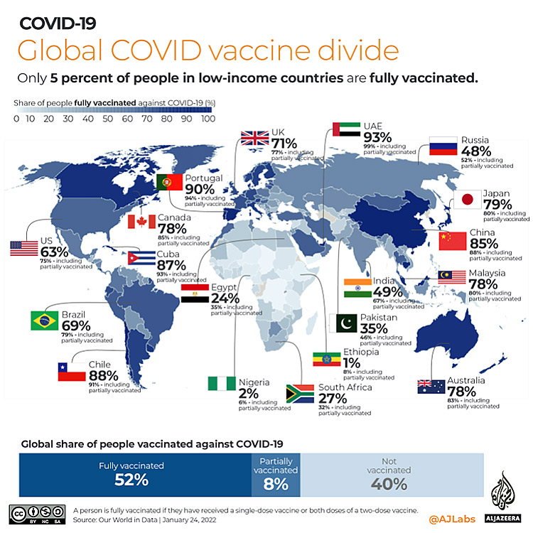 Εν τω μεταξύ, πολλές φτωχότερες χώρες που ακόμη περιμένουν εμβόλια μπορεί να απέχουν πολύ από το τέλος της πανδημίας. Μόνο το 5 τοις εκατό των ανθρώπων σε χώρες χαμηλού εισοδήματος είναι πλήρως εμβολιασμένοι σύμφωνα με τα τελευταία στοιχεία του Our World In Data.