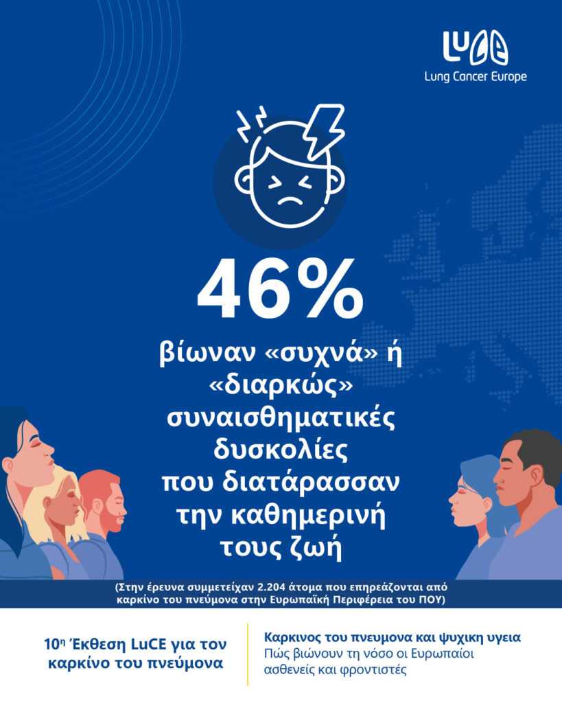 Η πλειονότητα των συμμετεχόντων (61,16%) ανέφερε ότι η διάγνωση καρκίνου του πνεύμονα είχε σημαντική επίπτωση στην ψυχική τους υγεία. Τα πιο συχνά συναισθήματα που επηρέασαν αρνητικά την ποιότητα ζωής ήταν η θλίψη, ο φόβος, το άγχος και η αβεβαιότητα. Ο φόβος αποτυχίας της θεραπείας ή εξέλιξης της νόσου αποτέλεσε τη μεγαλύτερη συναισθηματική δυσκολία (76,71%).