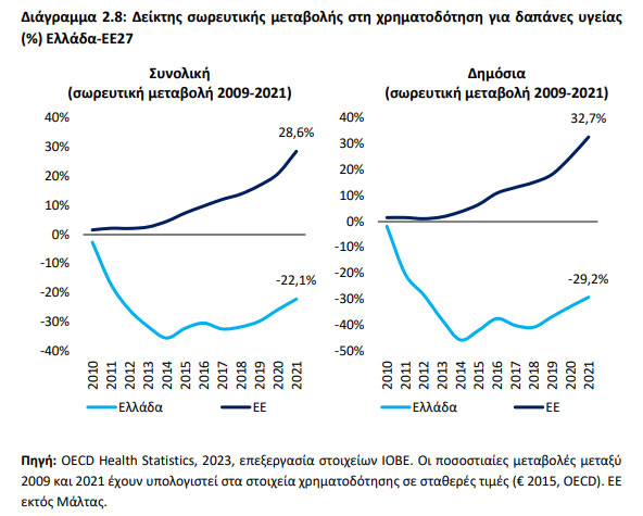 Σύμφωνα με τη μελέτη του ΙΟΒΕ για τα οικονομικά των δημόσιων νοσοκομείων στην Ελλάδα, η περίοδος πριν από την πανδημία χαρακτηρίζεται από πτώση της χρηματοδότησης για δαπάνες υγείας στην Ελλάδα, σε αντίθετη πορεία από το σύνολο της ΕΕ. H συνολική χρηματοδότηση για δαπάνες υγείας το 2021 σε σύγκριση με το 2009 είναι αυξημένη κατά 28,6% στην ΕΕ, ενώ στην Ελλάδα την ίδια περίοδο καταγράφεται μείωση σε ποσοστό 22,1%. Η δημόσια χρηματοδότηση για δαπάνες υγείας είναι αυξημένη κατά 32,7% στην ΕΕ, ενώ στην Ελλάδα η μείωση προσεγγίζει το 29,2%.