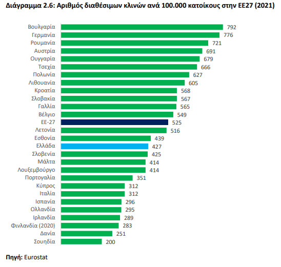 – Χαμηλότερα από τον μ.ο. της Ε.Ε. 27 (525 κλίνες ανά 100.000 κατοίκους) βρίσκεται η Ελλάδα με 427 διαθέσιμες κλίνες ανά 100.000 κατοίκους (2021). Οι συνολικές διαθέσιμες κλίνες στην Ελλάδα στο τέλος του 2021 διαμορφώθηκαν σε 48,9 χιλ. έναντι 52,4 χιλ. το 2010.
