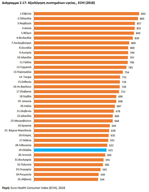 – Στην Ελλάδα καταγράφεται ένα από τα χαμηλότερα ποσοστά ικανοποίησης από τις παρεχόμενες υπηρεσίες φροντίδας, με 38% για το 2020, από 36% το 2010. Το ελληνικό σύστημα υγείας κατατάσσεται στην 29η θέση ανάμεσα σε 35 χώρες της Ευρώπης με 615 βαθμούς στον δείκτη αξιολόγησης των συστημάτων υγείας Euro Health Consumer Index (ECHI), υψηλότερα από Αλβανία, Ρουμανία, Ουγγαρία, Πολωνία, Βουλγαρία και Λετονία.