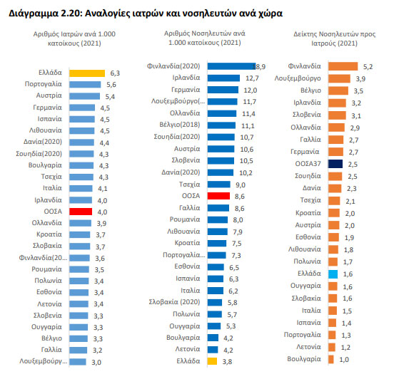 Ο δείκτης νοσηλευτών προς ιατρούς που εργάζονται σε νοσοκομεία στην Ελλάδα (1,6) είναι επίσης χαμηλότερος σε σχέση με τον μέσο όρο τους ΟΟΣΑ (2,5) και χαμηλότερος σε σύγκριση με τις περισσότερες χώρες της ΕΕ.