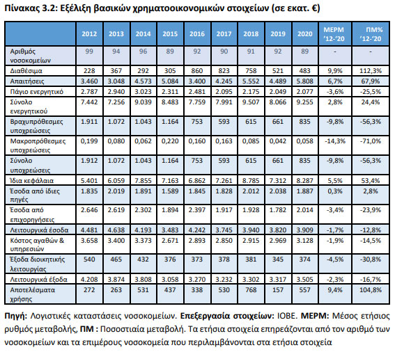 Από την ανάλυση του ΙΟΒΕ, που βασίζεται σε ένα δείγμα περίπου 90 νοσοκομείων ετησίως και 828 οικονομικών καταστάσεων για την περίοδο 2012-2020, καταγράφονται σημαντικές μεταβολές που οφείλονται στις εκτεταμένες μεταρρυθμίσεις που πραγματοποιήθηκαν με τα προγράμματα οικονομικής προσαρμογής. Σκοπός των μέτρων ήταν η μείωση των δημόσιων δαπανών μέσω διαρθρωτικών μεταρρυθμίσεων στον δημόσιο τομέα.