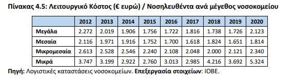 Αξιοσημείωτο είναι και το γεγονός ότι στο πρώτο έτος της πανδημίας (2020) το υψηλότερο κόστος ανά νοσηλευθέντα εντοπίζεται στα μικρά νοσοκομεία, με 5.324 ευρώ (είναι το υψηλότερο για όλα τα νοσοκομεία την περίοδο 2012 – 2020), ενώ ακολουθούν, με 2.340 ευρώ ανά νοσηλευθέντα, τα μικρομεσαία. Το χαμηλότερο κόστος ανά νοσηλευθέντα το 2020 καταγράφεται στα μεσαία με 1.814 ευρώ.