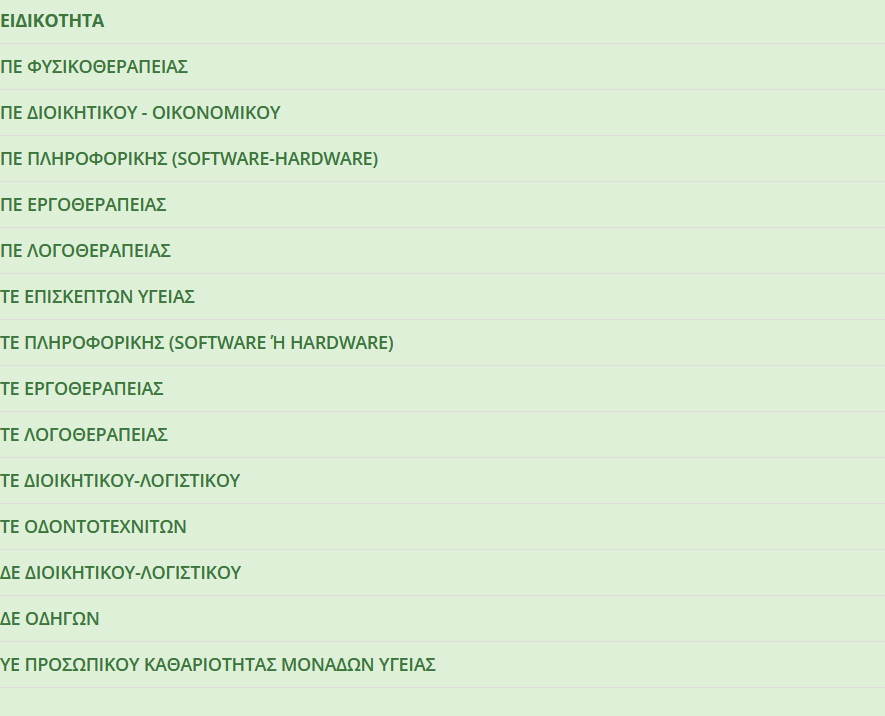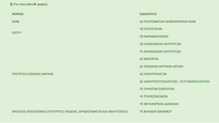 Για τους κάτωθι φορείς, οι ειδικότητες είναι οι παρακάτω: