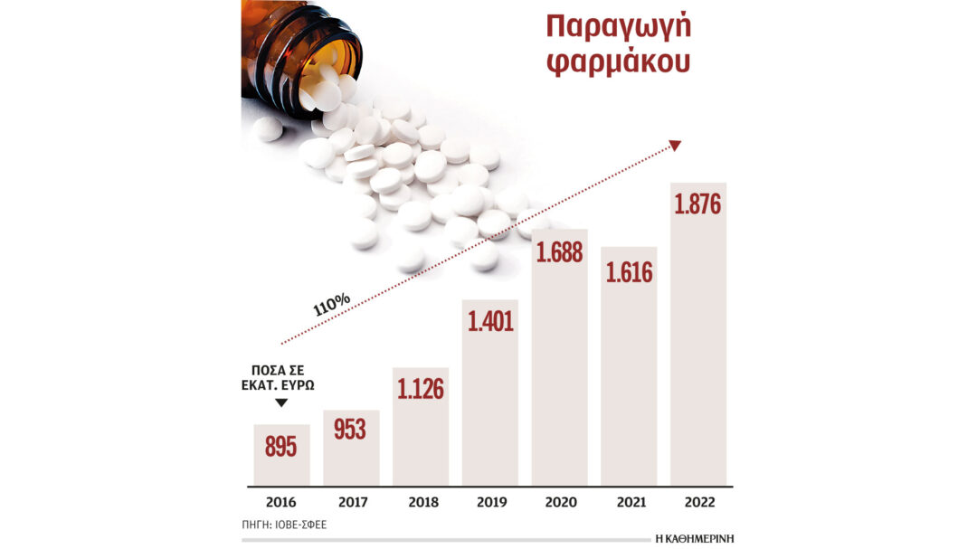 Ενας από τους κλάδους της μεταποίησης που παρουσιάζει σημαντική παραγωγική δυναμική είναι αυτός του φαρμάκου, με την παραγωγή να διπλασιάζεται τα τελευταία επτά χρόνια, προσεγγίζοντας σε αξία τα 2 δισ. ευρώ το 2022. Σύμφωνα με στοιχεία από την ετήσια έρευνα που εκπόνησε το ΙΟΒΕ σε συνεργασία με τον ΣΦΕΕ (Σύνδεσμος Φαρμακευτικών Επιχειρήσεων Ελλάδος) με τίτλο «Η φαρμακευτική αγορά στην Ελλάδα: Γεγονότα και Στοιχεία 2022», η παραγωγή φαρμάκου στην Ελλάδα πέρυσι ανήλθε σε αξία στο 1,9 δισ. ευρώ, σημειώνοντας άνοδο 16,1% σε σύγκριση με το 2021, οπότε αυτή διαμορφώθηκε στο 1,6 δισ. ευρώ. «Πρόκειται για έναν από τους κλάδους της μεταποίησης που παρουσιάζει σημαντική παραγωγική δυναμική», σημείωσε στο πλαίσιο συνέντευξης Τύπου για την παρουσίαση της έρευνας ο Αγγελος Τσακανίκας, επιστημονικός σύμβουλος του ΙΟΒΕ. Η παραγωγή του κλάδου είναι διπλάσια σε σύγκριση με τον μέσο όρο της περιόδου 2009-2017, οπότε είχε διαμορφωθεί στα 906 εκατ. ευρώ, γεγονός που καταδεικνύει τις προοπτικές ανάπτυξης του κλάδου της φαρμακοβιομηχανίας.