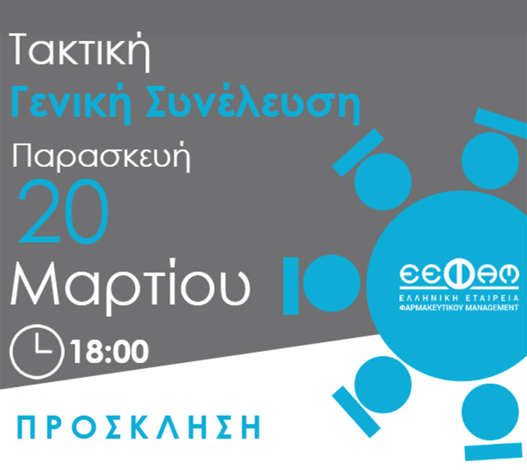 Κατόπιν απόφασης του Διοικητικού Συμβουλίου της Ελληνικής Εταιρίας Φαρμακευτικού Management(Ε.Ε.Φα.Μ.), σας προσκαλούμε σε Τακτική Γενική Συνέλευση η οποία θα πραγματοποιηθεί την Παρασκευή 20 Μαρτίου 2026 και ώρα 18:00, με φυσική παρουσία στα γραφεία της Ε.Ε.Φα.Μ., Τζαβέλα 42 Β, Νέο Ψυχικό, 154 51 ή μέσω zoom meeting: https://us06web.zoom.us/j/89384190481?pwd=X9Y62zc1eAFV3SMZNEJH1a6eoxtkL8.1