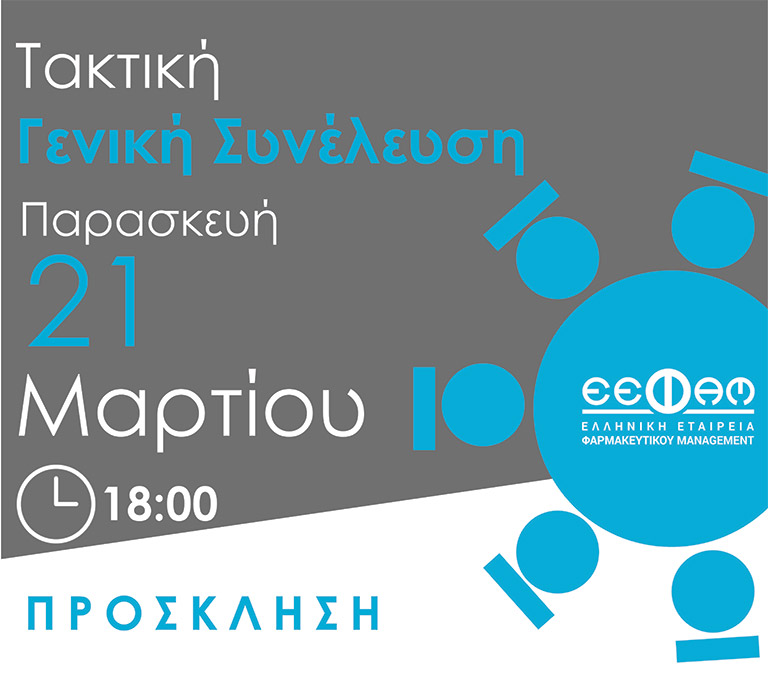 Κατόπιν απόφασης του Διοικητικού Συμβουλίου της Ελληνικής Εταιρίας Φαρμακευτικού Management (Ε.Ε.Φα.Μ.), σας προσκαλούμε σε Τακτική Γενική Συνέλευση η οποία θα πραγματοποιηθεί την Παρασκευή 21 Μαρτίου 2025 και ώρα 18:00, με φυσική παρουσία στα γραφεία της Ε.Ε.Φα.Μ., Τζαβέλα 42 Β, Νέο Ψυχικό, 154 51 ή μέσω zoom meeting: