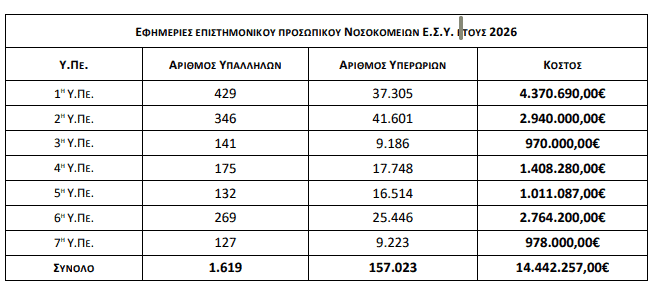 Το προσωπικό που υπηρετεί με απόσπαση ή βρίσκεται σε εκπαιδευτική άδεια αποζημιώνεται από το νοσοκομείο στο οποίο παρέχει υπηρεσία. Ο μηνιαίος προγραμματισμός εγκρίνεται από τα διοικητικά συμβούλια των νοσοκομείων και αναρτάται σε εμφανή σημεία, όπως η είσοδος και τα Τμήματα Επειγόντων Περιστατικών.