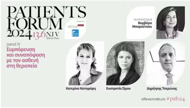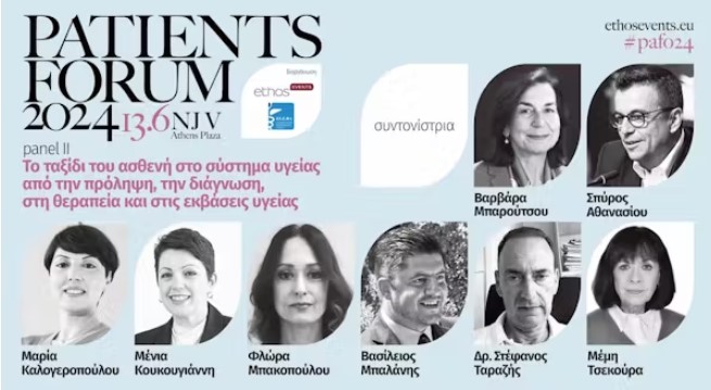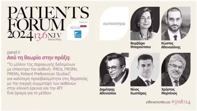 Η συμμετοχή των ασθενών στην συμπαραγωγή ελληνικών δεδομένων στο ταξίδι του ασθενή, για την πρόληψη, διάγνωση και θεραπεία-εκβάσεις υγείας θα συζητηθεί στο Patients Forum 2024. Επιδίωξη είναι να αναδειχθεί τόσο ο ρόλος των ασθενών στην τοπική συνδιαμόρφωση των αναγκών και εστίασης σε πεδία κλινικών δοκιμών & RnD ενδιαφέροντος για την χώρα, όσο και η ανάγκη συλλογής και ανάλυσης ασθενοκεντρικών δεδομένων με τη χρήση ειδικών μεθοδολογιών και αξιοποίησης τους στην λήψη αποφάσεων στην Αξιολόγηση Τεχνολογιών Υγείας.