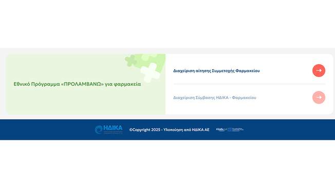 Ο ΠΦΣ ενημερώνει ότι η ιστοσελίδα της ΗΔΙΚΑ paroxoi.proliptikes.gov.gr υποστηρίζει πλέον την ηλεκτρονική αίτηση των φαρμακείων που επιθυμούν να ενταχθούν στις δράσεις του εθνικού προγράμματος «Προλαμβάνω».