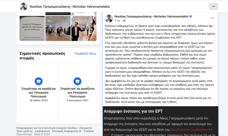 Ο κ. Γιατρομανωλάκης στην καταγγελία που έκανε στα social media προκειμένου να αναγνωστεί προφανώς από πολλούς, υποστηρίζει ότι ενώ είχε κάνει ένσταση για τη βαθμολόγηση του και δεν γνώριζε το αποτέλεσμα αυτής, υπήρξαν δημοσιεύματα του Τύπου ότι η ένστασή του είχε απορριφθεί.
