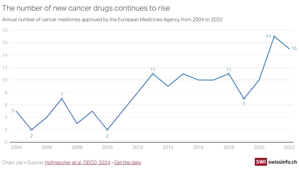 Οι δαπάνες για φάρμακα κατά του καρκίνου παγκοσμίως αυξήθηκαν κατά 75% τα τελευταία πέντε χρόνια, φτάνοντας τα 252 δισεκατομμύρια δολάρια (200 δισεκατομμύρια CHF) το 2024, σύμφωνα με την αμερικανική εταιρεία ανάλυσης δεδομένων υγείας IQVIA. Εν μέσω αυξανόμενων ποσοστών καρκίνου, οι δαπάνες αναμένεται να ξεπεράσουν τα 440 δισεκατομμύρια δολάρια έως το 2029.