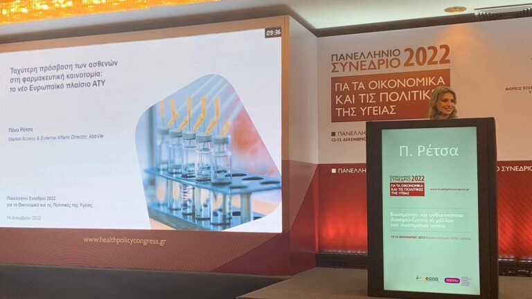 Την ευκαιρία ένταξης της Ελλάδας στον χάρτη των χωρών με πολύ γρήγορη πρόσβαση στη φαρμακευτική καινοτομία ανέδειξε η Market Access & External Relations Director της AbbVie, κα. Πένυ Ρέτσα, από το βήμα του Πανελληνίου Συνεδρίου για τα Οικονομικά και τις Πολιτικές της Υγείας, την Τετάρτη 14 Δεκεμβρίου 2022, αναδεικνύοντας τον σημαντικό ρόλο που μπορεί να παίξει η Ελληνική Επιτροπή Αξιολόγησης Τεχνολογιών Υγείας και η εφαρμογή του νέου Ευρωπαϊκού Κανονισμού, στη χώρα μας.
