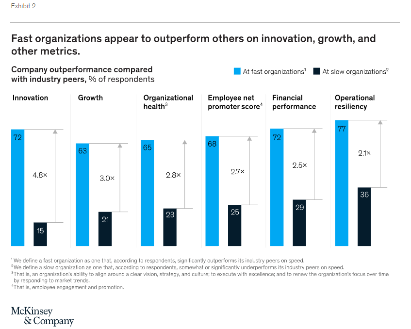 Our research shows that a concerted effort to become faster pays off (Exhibit 2). Fast organizations outperform others by a wide margin on a range of outcomes, including profitability, operational resilience, organizational health, and growth.4 Often, these advantages are even more significant in difficult times, when decisions have more important consequences, and it is necessary to outpace competitors at every phase of the process. That kind of speed will be essential during the next few years. The devastating effects of cost increases eroding affordability and margins require scaling-up speeds (for example, executing a six-fold increase in the number of patients in risk-bearing, value-based care arrangements in the next five years) unlike those the industry has ever attempted.