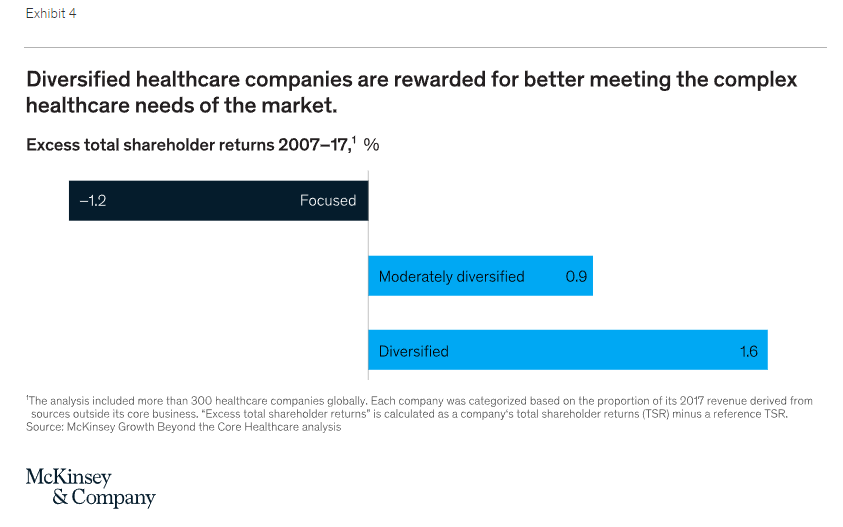 Several incumbents have already begun to see success through diversification. Large payers, for instance, have created diversified business units operating in care delivery, data and analytics, pharmacy services, care and utilization management, and other technology and service businesses. Some providers have created very profitable units to manage revenue cycles and enable value-based care. Our analysis has shown that diversified healthcare companies can deliver higher returns. Although this analysis is based on the returns of publicly traded companies, in our experience private not-for-profit healthcare organizations also often see financial benefits from diversification (Exhibit 4).