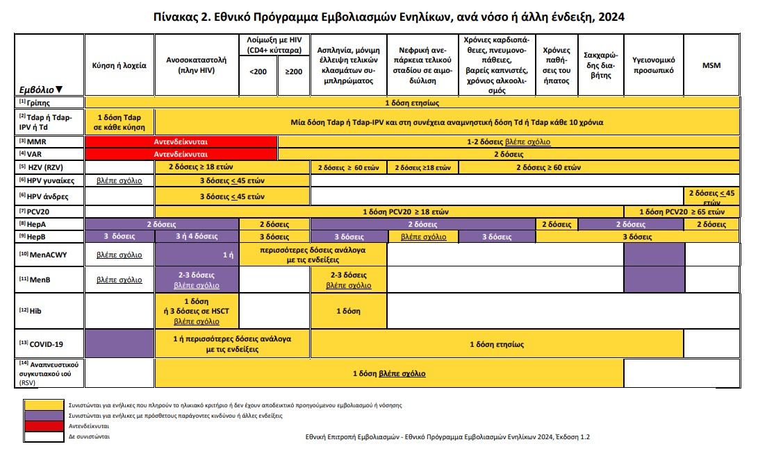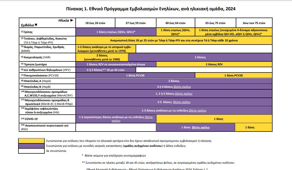 Σημειώνεται ότι για πρώτη φορά εισάγεται στο Εθνικό Πρόγραμμα ο ετήσιος εμβολιασμός έναντι της Covid-19.  Συγκριμένα, συνιστάται μια δόση του επικαιροποιημένου μονοδύναμου εμβολίου σε άτομα ηλικίας 60 ετών και άνω και ενήλικες με έναν ή περισσότερους από επιβαρυντικούς παράγοντες ή χρόνια νοσήματα.
