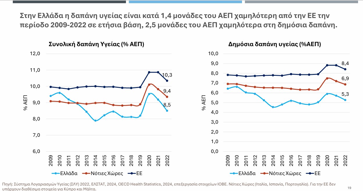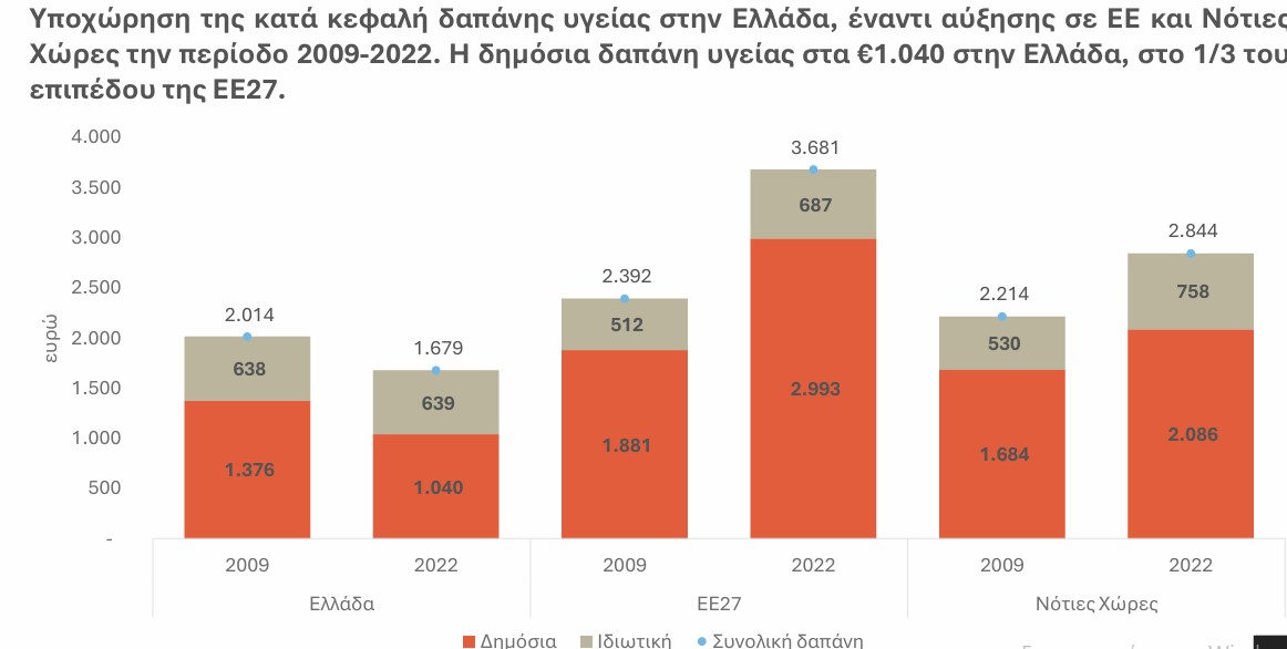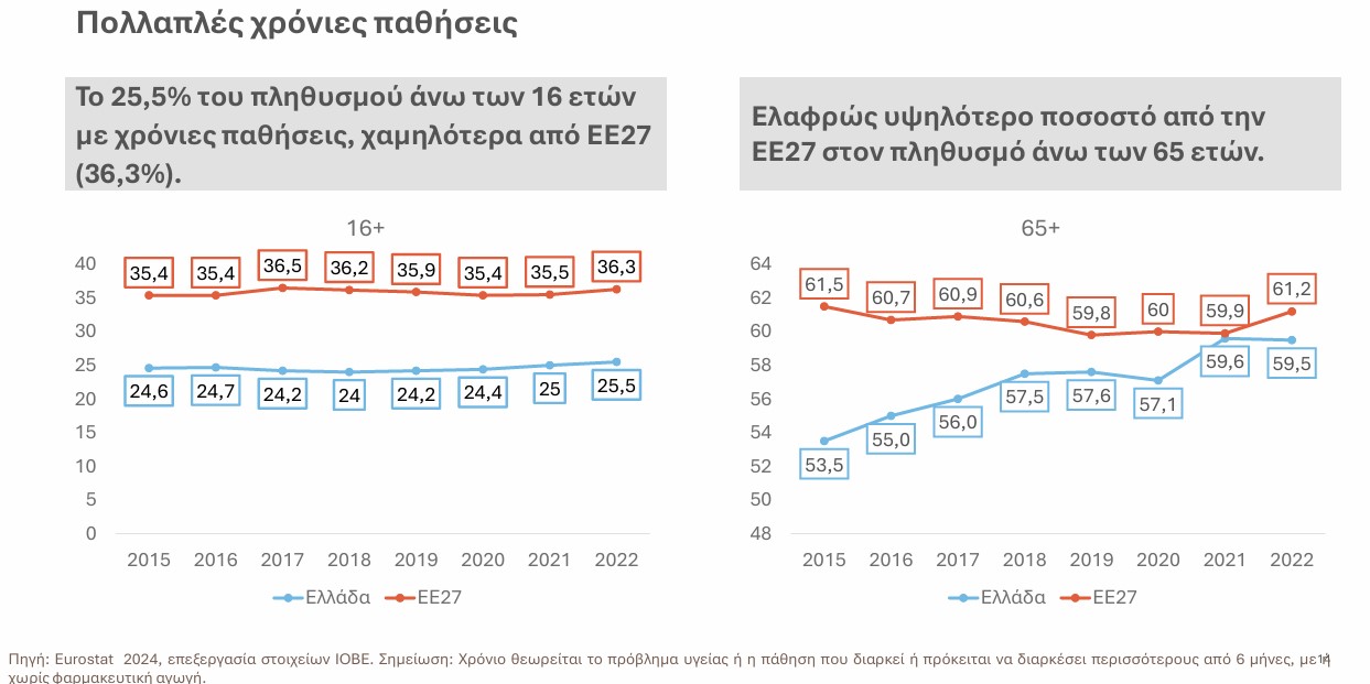 Η μείωση κρατικών πόρων πηγάζει από την περίοδο της οικονομικής κρίσης και την επιβολή δημοσιονομικών μέτρων. Επίδραση ασκεί η σταδιακή γήρανση του πληθυσμού. Ενδεικτικά, το 2022, το ποσοστό των ατόμων άνω των 65 ετών ανέρχεται στο 22,9% του συνολικού πληθυσμού, ενώ έως το 2070 αναμένεται να αυξηθεί σταδιακά στο 32,8%, οδηγώντας σε αυξημένες ανάγκες για δαπάνες υγείας και φαρμάκου λόγω της γήρανσης του πληθυσμού. Ως γνωστόν στην Ελλάδα έχουμε υπογεννητικότητα, αυξάνονται οι θάνατοι και απομειώνεται σταδιακά ο ενεργός πληθυσμός. Την ίδια χρονιά, το ποσοστό του πληθυσμού ηλικίας 16 ετών και άνω με χρόνιο πρόβλημα υγείας παρουσιάζει αυξητική τάση, φτάνοντας το 25,5%, ενώ στην ηλικιακή κατηγορία άνω των 65 ετών αγγίζει το 60%.