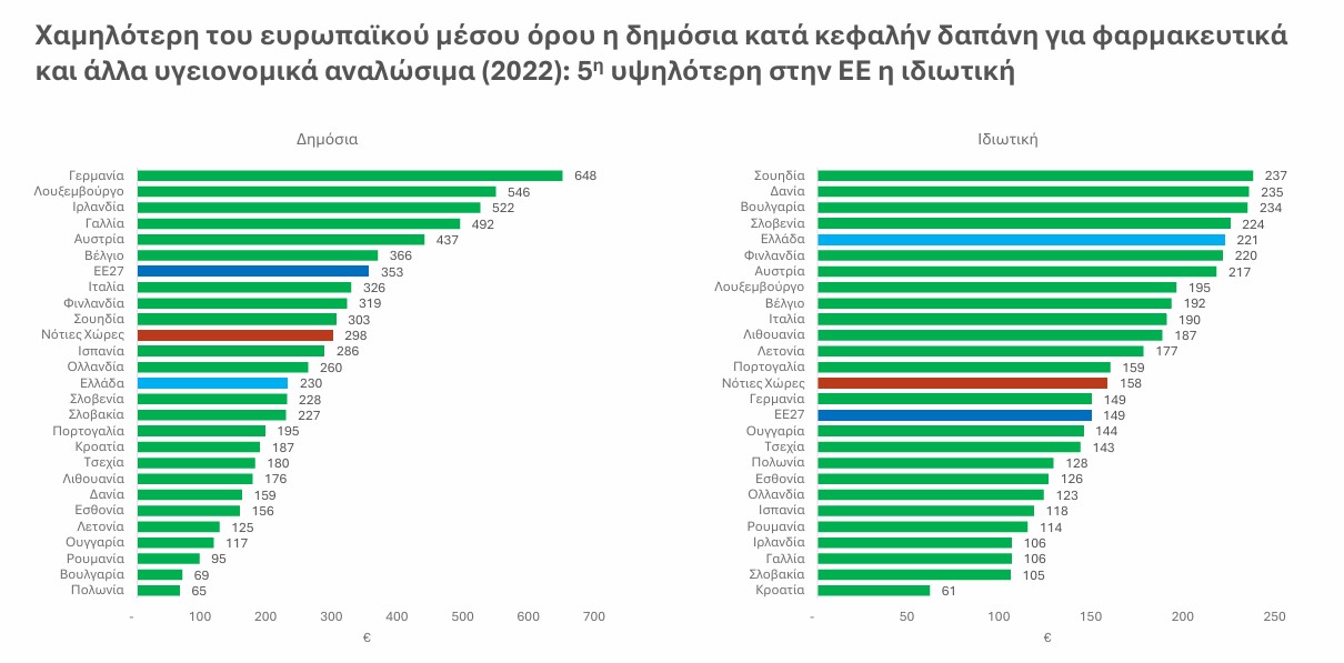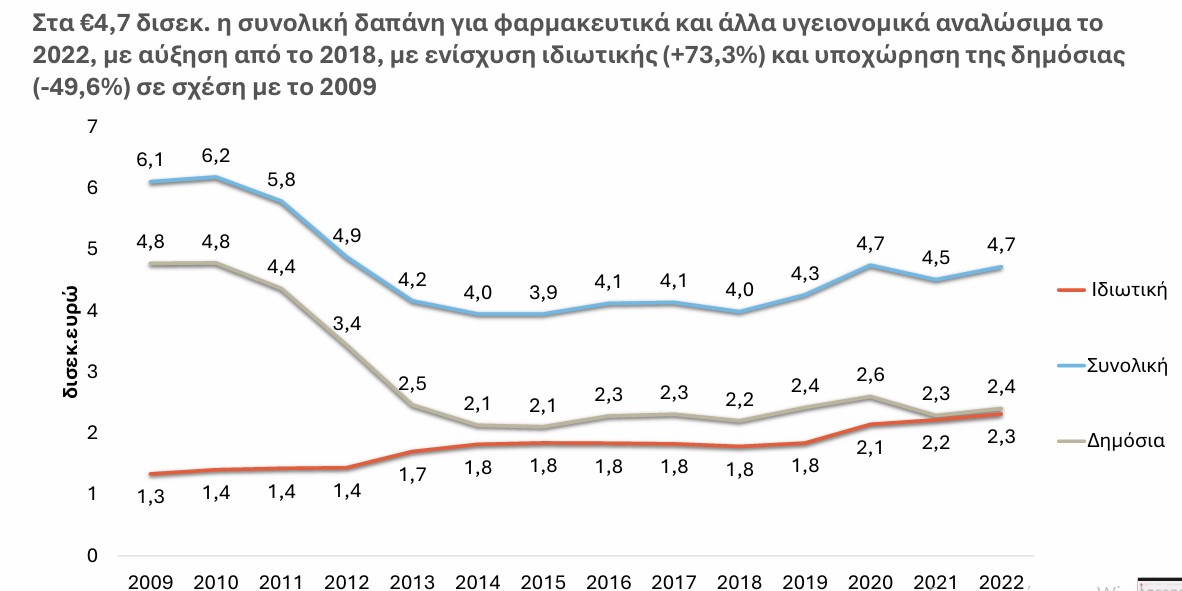 Η δημόσια δαπάνη για το 2022 ήταν στα 2,7 δισεκ. ευρώ, με εκτίμηση για 2,8 δισεκ.ευρώ το 2023, ενώ η συμμετοχή της φαρμακοβιομηχανίας στη φαρμακευτική δαπάνη αυξήθηκε για το 2022 στα €2,9 δισεκ., και στα €3,5 δισεκ. το 2023 (εκτίμηση). Τα τελευταία δύο χρόνια, η συμμετοχή του κλάδου στη φαρμακευτική δαπάνη ξεπερνά εκείνη του Δημοσίου.