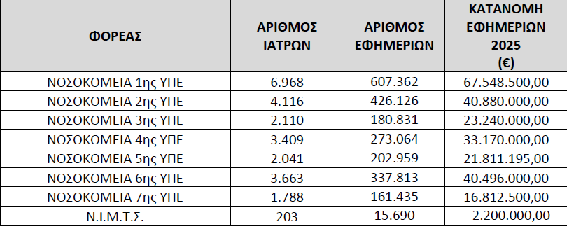 Αναλυτικότερα σύμφωνα με την κατανομή των εφημεριών, στους 24.507 νοσοκομειακούς γιατρούς θα διατεθούν συνολικά 247.214.195,00 εκατομμύρια ευρώ .
