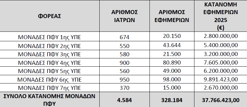 Με την ίδια απόφαση μειώνεται το ποσό κατανομής εφημεριών ιατρών και οδοντιάτρων των Μονάδων Π.Φ.Υ. κατά 233.577,00 ευρώ (€) και ο πίνακας κατανομής του συνολικού ποσού κατόπιν των σχετικών αιτημάτων των Διοικήσεων των Υγειονομικών Περιφερειών της χώρας, διαμορφώνεται ως εξής: